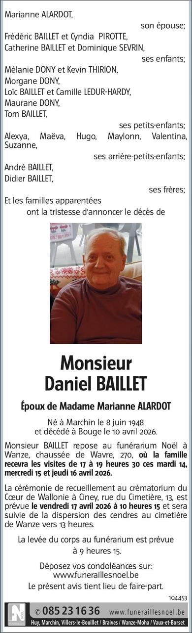 Avis de décès de Monsieur Daniel BAILLET