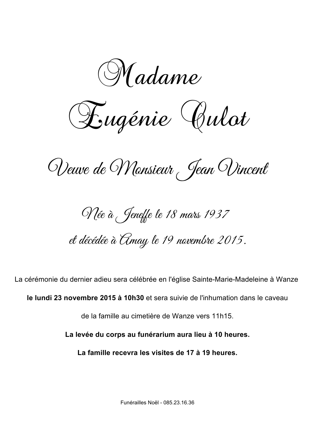 Décédée à Amay (4540) le jeudi 19 novembre 2015 à l'âge de 78 ans