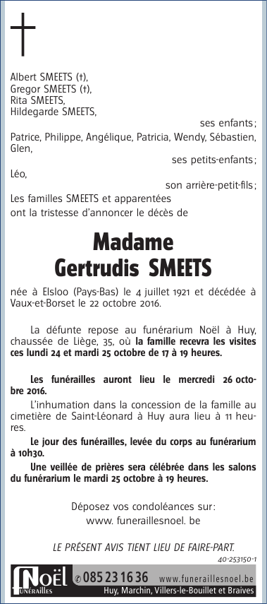 Décédée à Vaux-et-Borset (4530) le samedi 22 octobre 2016 à l'âge de 95 ans