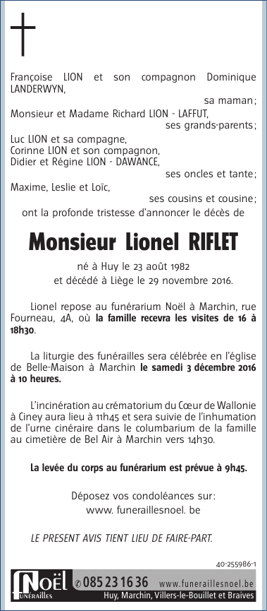 Décédé à Liège (4000) le mardi 29 novembre 2016 à l'âge de 34 ans