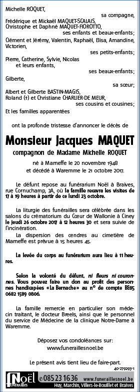 Décédé à Waremme (4300) le dimanche 22 octobre 2017 à l'âge de 68 ans