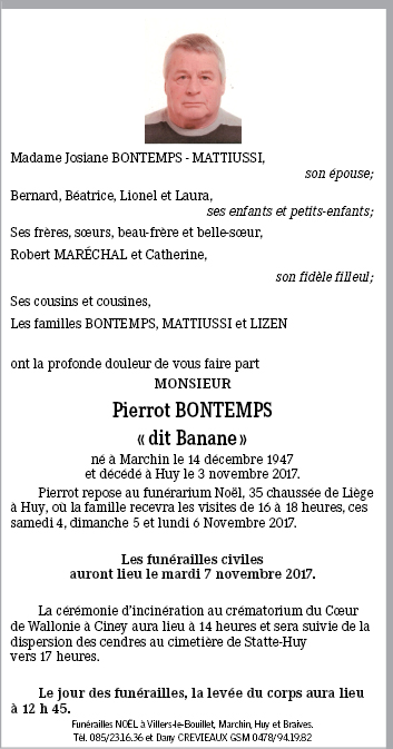 Décédé à Huy (4500) le vendredi 3 novembre 2017 à l'âge de 69 ans
