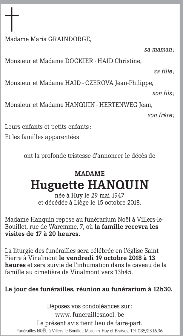 Décédée à Liège (4000) le mardi 16 octobre 2018 à l'âge de 71 ans