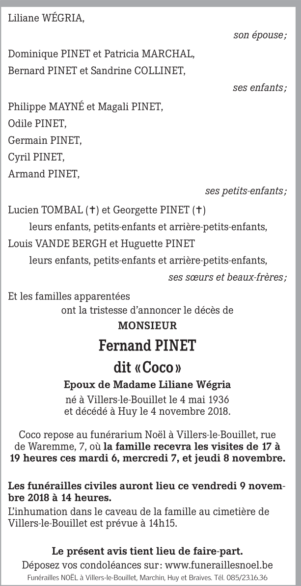 Décédé à Tihange (4500) le dimanche 4 novembre 2018 à l'âge de 82 ans