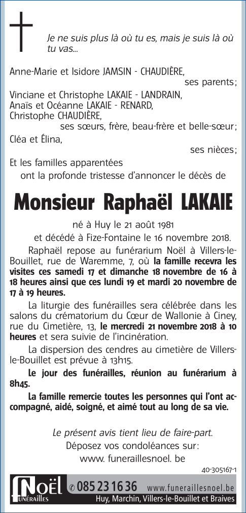 Décédé à Fize-Fontaine (4530) le vendredi 16 novembre 2018 à l'âge de 37 ans