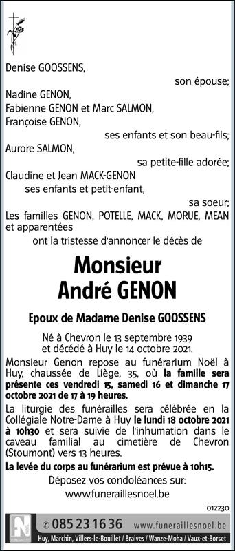 Décédé à Huy (4500) le jeudi 14 octobre 2021 à l'âge de 82 ans