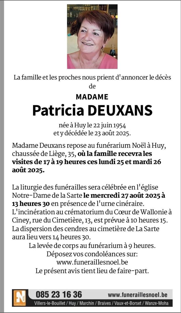 Décédée à Huy (4500) le samedi 23 août 2025 à l'âge de 71 ans