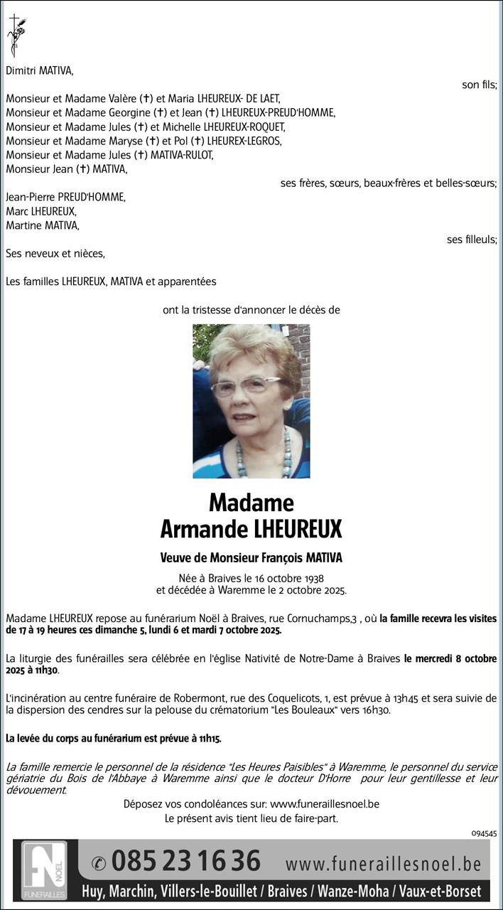 Décédée à Waremme (4300) le jeudi 2 octobre 2025 à l'âge de 86 ans