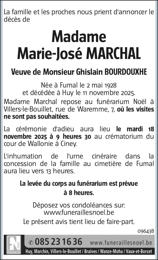 Décédée à Huy (4500) le mardi 11 novembre 2025 à l'âge de 97 ans