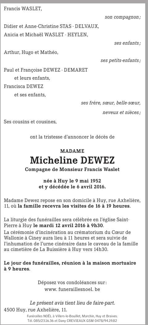 Décédée à Huy (4500) le mercredi 6 avril 2016 à l'âge de 63 ans