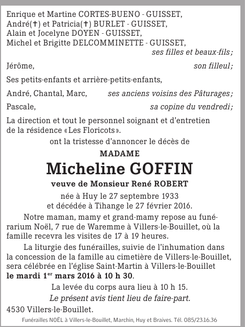 Décédée à Tihange (4500) le samedi 27 février 2016 à l'âge de 82 ans