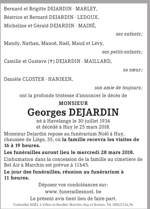 Décédé à Huy (4500) le dimanche 25 mars 2018 à l'âge de 83 ans