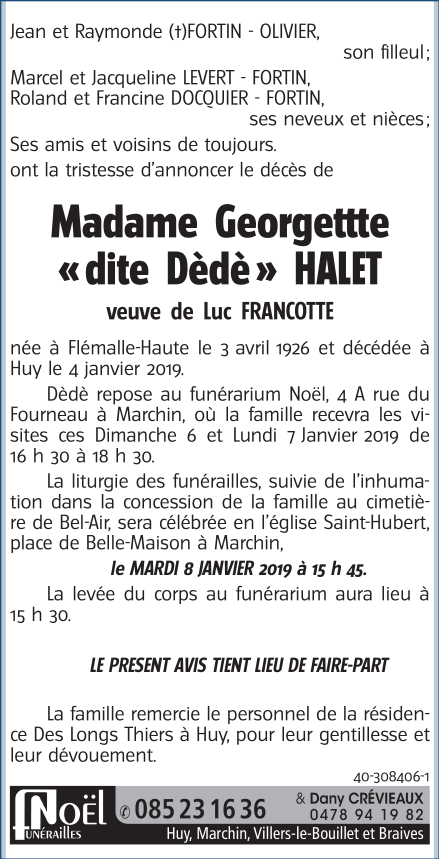 Décédée à Huy (4500) le samedi 5 janvier 2019 à l'âge de 92 ans