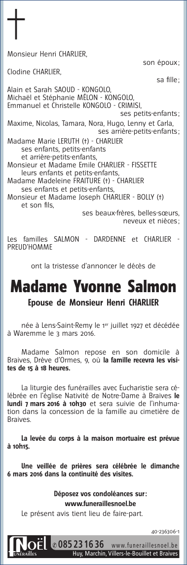 Décédée à Waremme (4300) le jeudi 3 mars 2016 à l'âge de 88 ans
