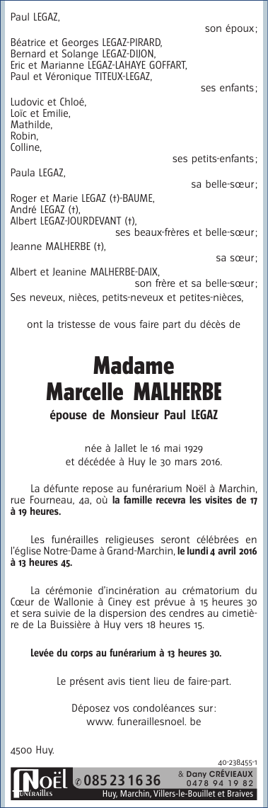 Décédée à Huy (4500) le mercredi 30 mars 2016 à l'âge de 86 ans