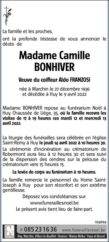Décédée à Huy (4500) le samedi 9 avril 2022 à l'âge de 85 ans