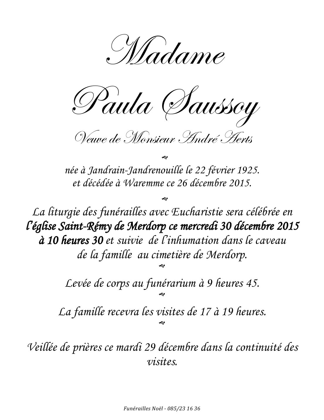 Décédée à Waremme (4300) le samedi 26 décembre 2015 à l'âge de 90 ans