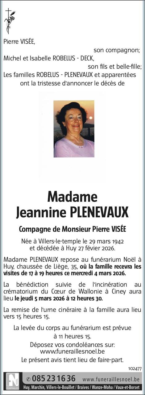 Décédée à Huy (4500) le vendredi 27 février 2026 à l'âge de 83 ans