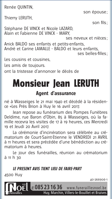 Né à Wasseiges (4219) le lundi 20 mai 1940