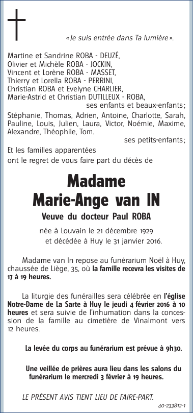 Décédée à Huy (4500) le dimanche 31 janvier 2016 à l'âge de 86 ans