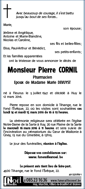 Décédé à Huy (4500) le samedi 12 mars 2016 à l'âge de 68 ans