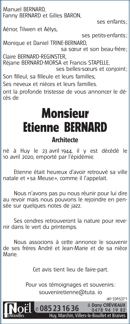 Décédé à Huy (4500) le vendredi 10 avril 2020 à l'âge de 75 ans