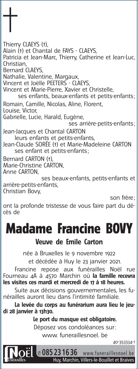 Décédée à Huy (4500) le samedi 23 janvier 2021 à l'âge de 98 ans