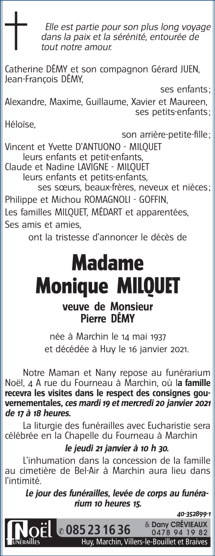 Décédée à Huy (4500) le samedi 16 janvier 2021 à l'âge de 83 ans