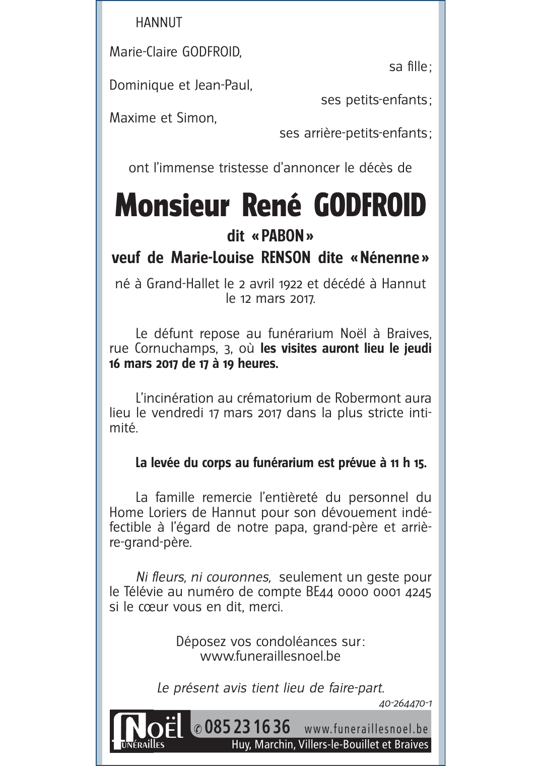 Décédé à Hannut (4280) le dimanche 12 mars 2017 à l'âge de 94 ans