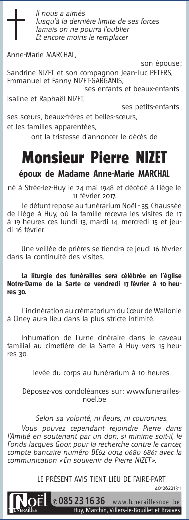 Décédé à Liège (4000) le samedi 11 février 2017 à l'âge de 68 ans