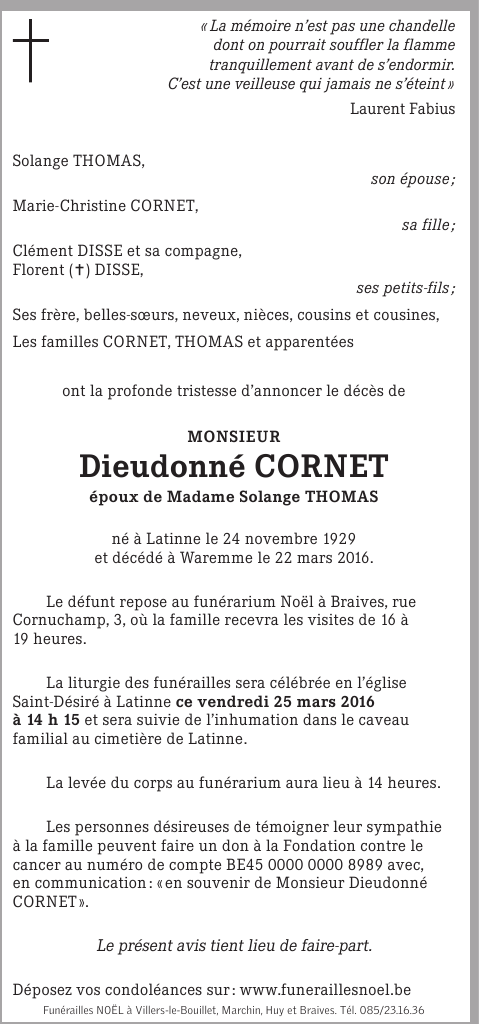Décédé à Waremme (4300) le mardi 22 mars 2016 à l'âge de 86 ans