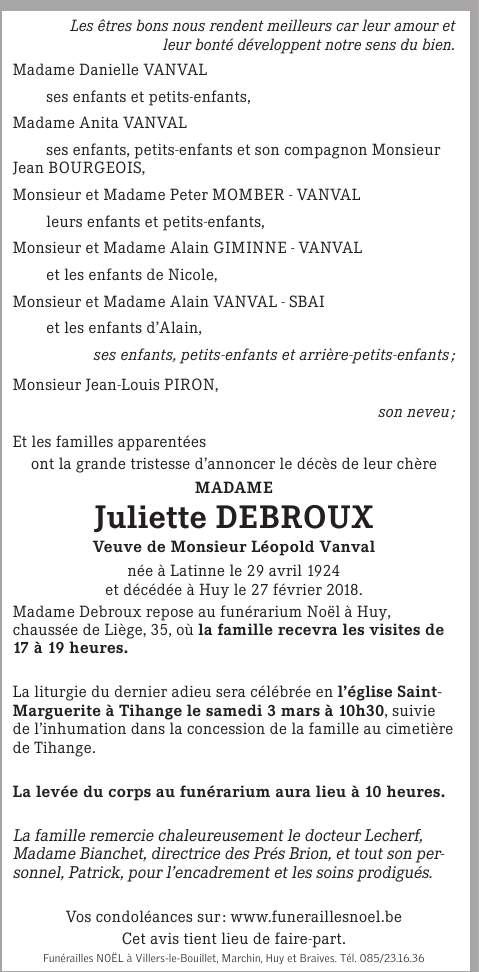 Décédée à Gives (4500) le mardi 27 février 2018 à l'âge de 93 ans