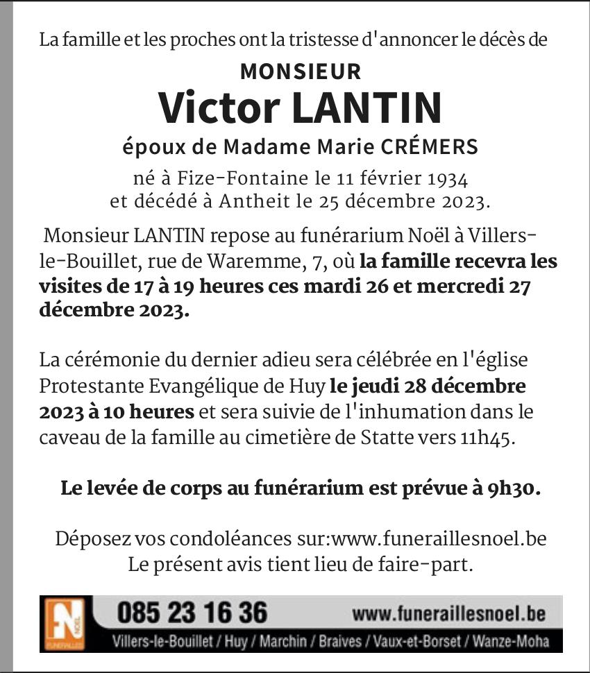 Décédé à Antheit (4520) le lundi 25 décembre 2023 à l'âge de 89 ans
