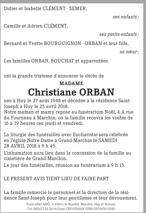 Décédée à Huy (4500) le mercredi 25 avril 2018 à l'âge de 69 ans