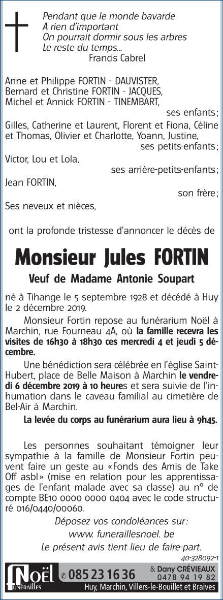 Décédé à Huy (4500) le lundi 2 décembre 2019 à l'âge de 91 ans