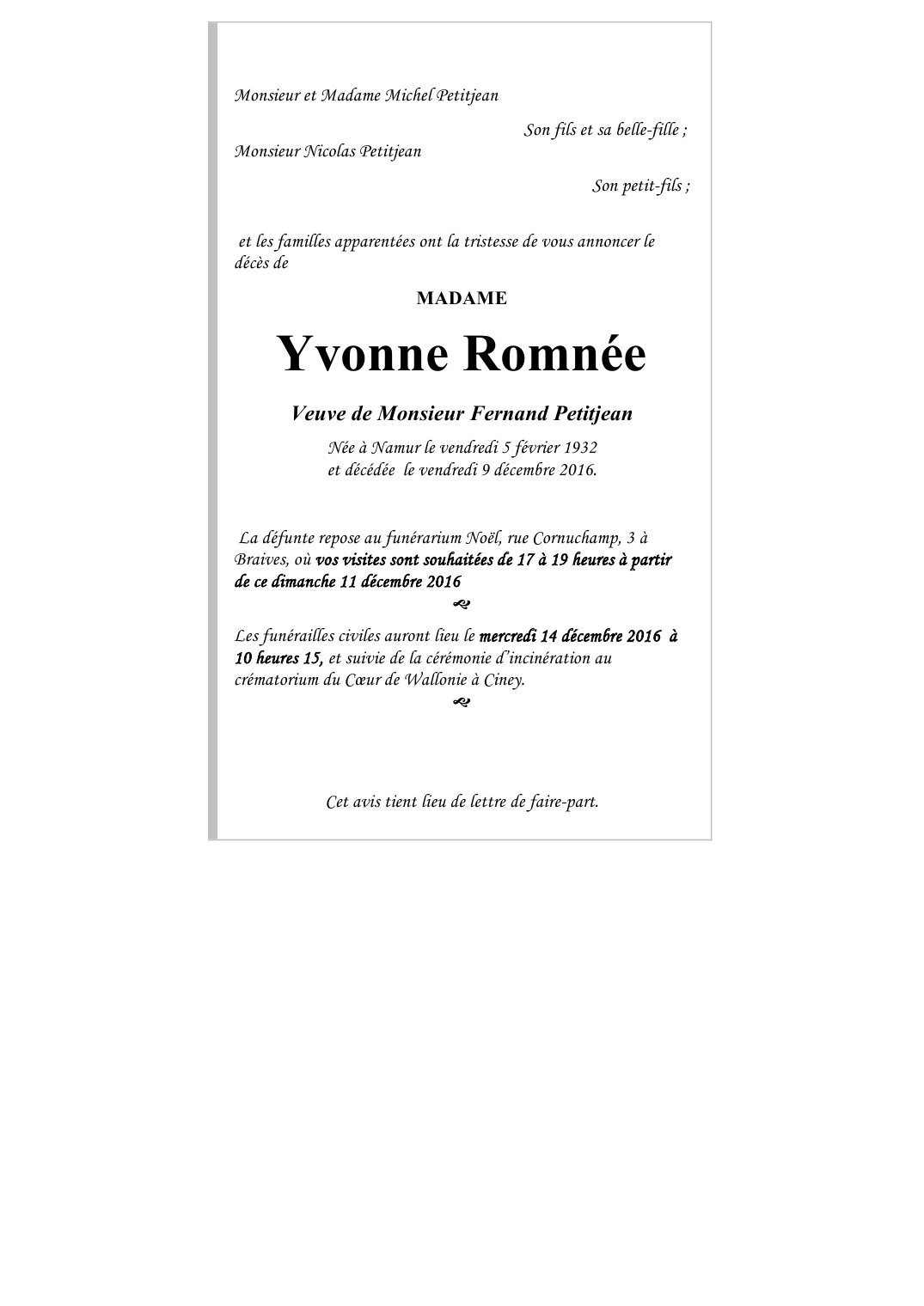 Décédée à Waremme (4300) le samedi 10 décembre 2016 à l'âge de 84 ans