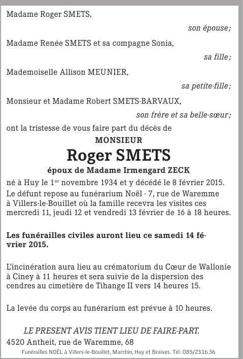 Décédé à Huy (4500) le dimanche 8 février 2015 à l'âge de 80 ans