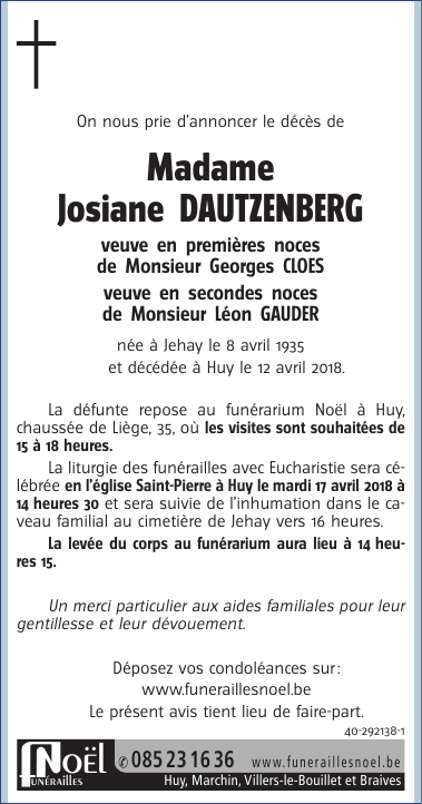 Décédée à Huy (4500) le jeudi 12 avril 2018 à l'âge de 83 ans