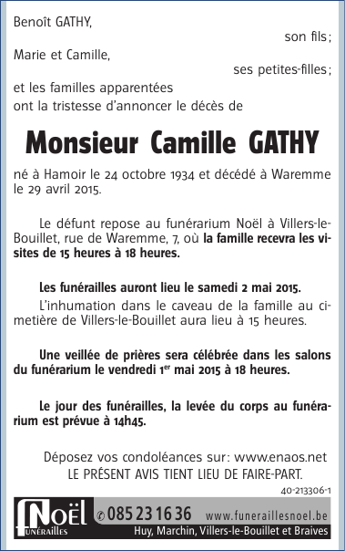 Décédé à Waremme (4300) le mercredi 29 avril 2015 à l'âge de 80 ans
