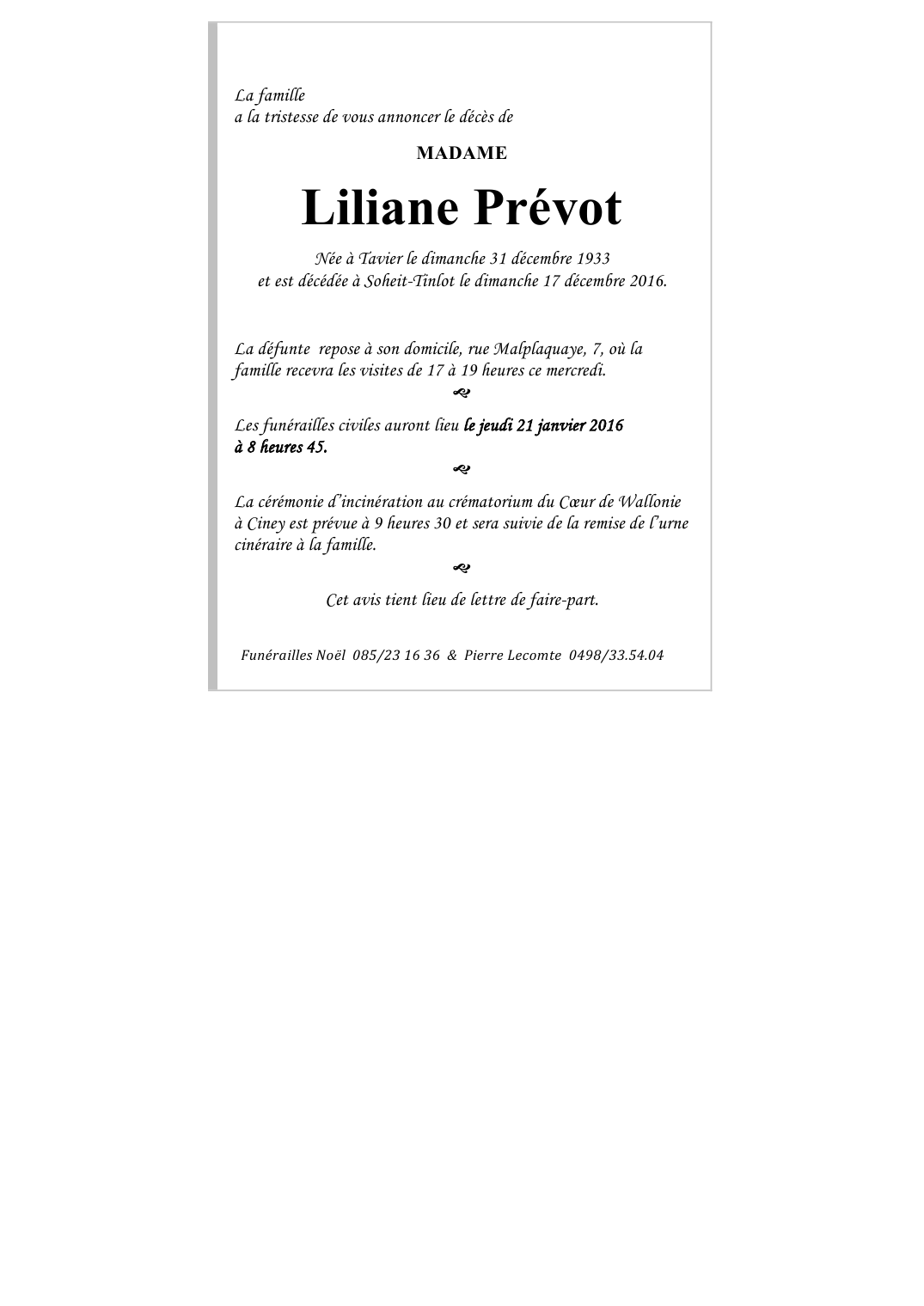 Décédée à Soheit-Tinlot (4557) le dimanche 17 janvier 2016 à l'âge de 82 ans