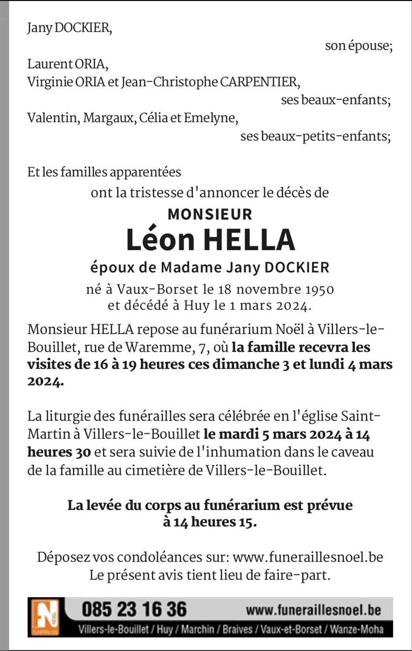 Décédé à Huy (4500) le vendredi 1 mars 2024 à l'âge de 73 ans