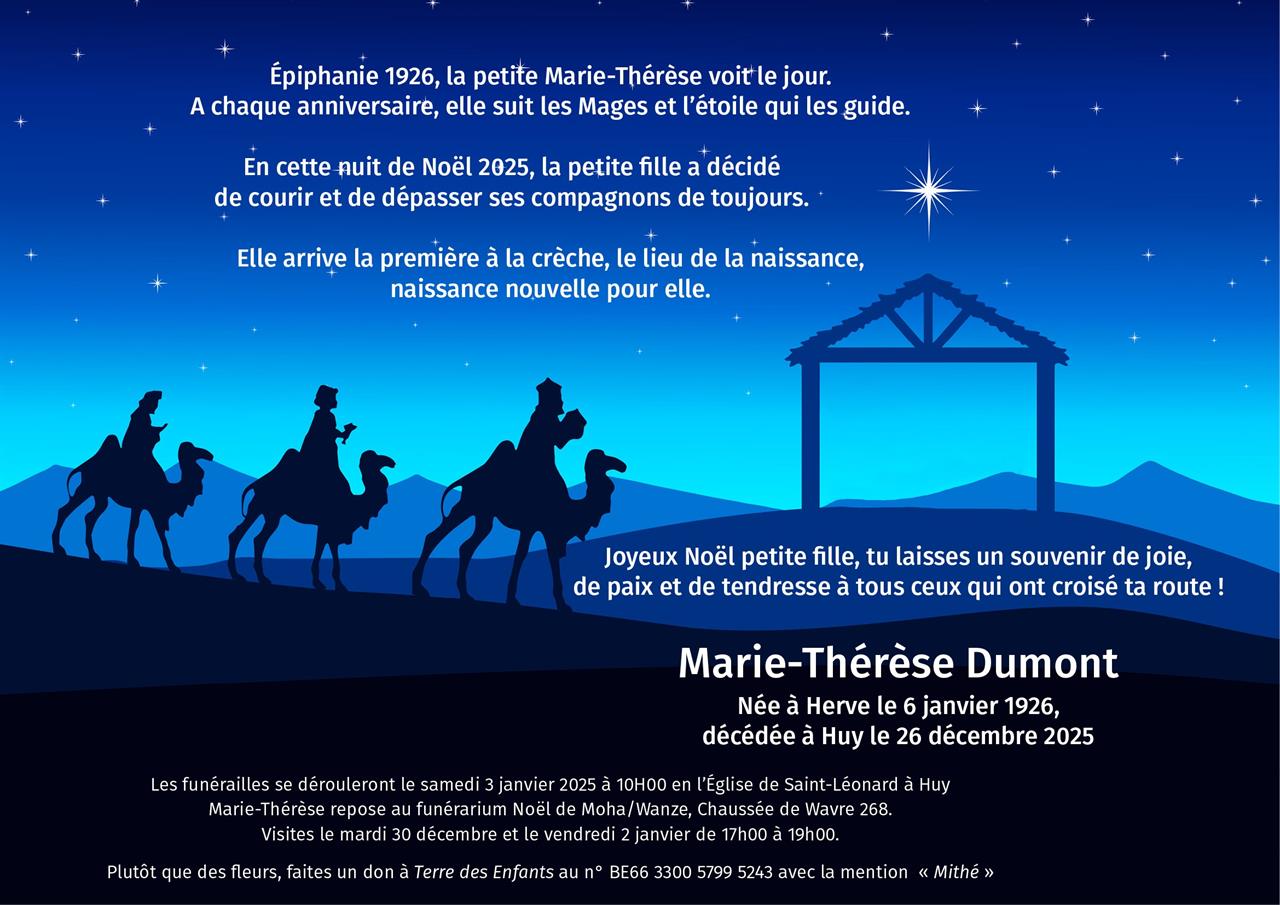Décédée à Huy (4500) le vendredi 26 décembre 2025 à l'âge de 99 ans