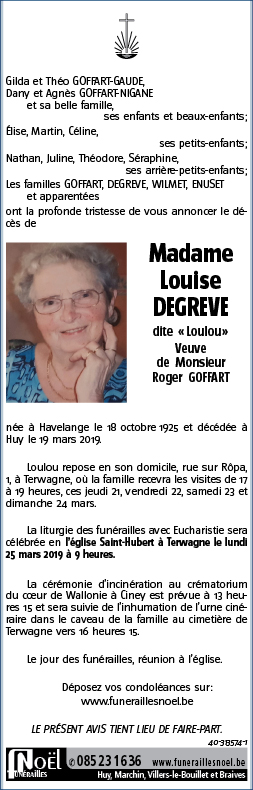 Décédée à Huy (4500) le mardi 19 mars 2019 à l'âge de 93 ans