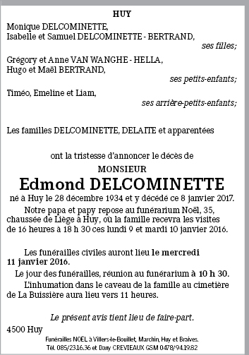 Décédé à Huy (4500) le dimanche 8 janvier 2017 à l'âge de 82 ans