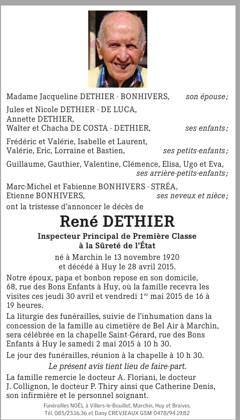 Décédé à Huy (4500) le mardi 28 avril 2015 à l'âge de 94 ans