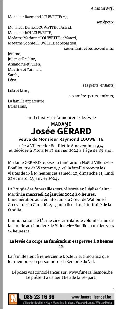 Décédée à Moha (4520) le mercredi 17 janvier 2024 à l'âge de 89 ans