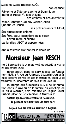 Décédé à Huy (4500) le lundi 24 décembre 2018 à l'âge de 80 ans
