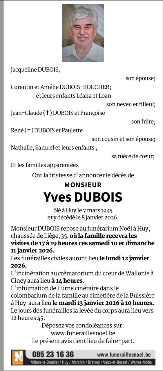 Décédé à Huy (4500) le jeudi 8 janvier 2026 à l'âge de 80 ans