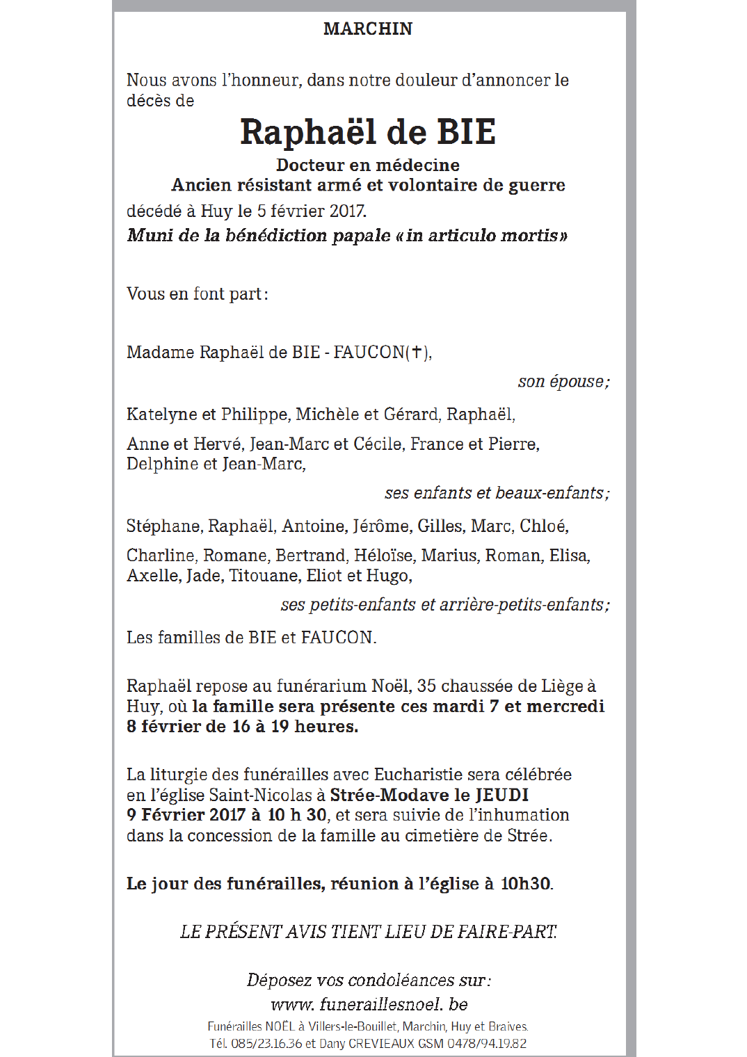 Décédé à Huy (4500) le dimanche 5 février 2017 à l'âge de 88 ans