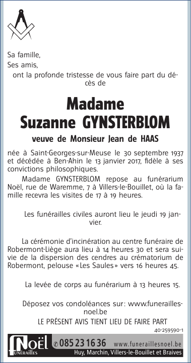 Décédée à Ben-Ahin (4500) le vendredi 13 janvier 2017 à l'âge de 79 ans